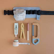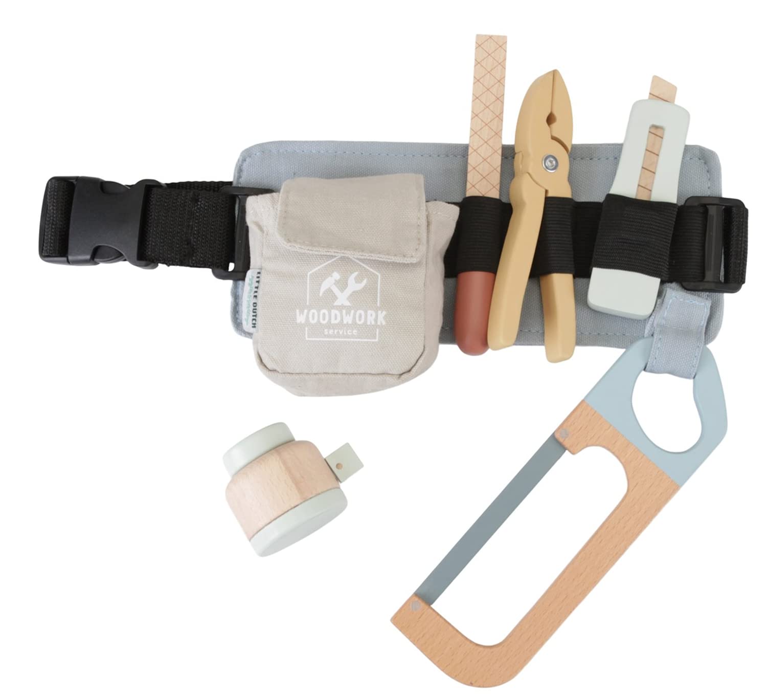 Bellissimo cinturone da lavoro completo di tutti gli attrezzi indispensabili per il lavoro, dalla sega alla pinza. Tela resistente e regolabile in vita, attrezzi tutti in legno da fonti responsabili FSC e colori atossici. Consigliata dai 3 anni