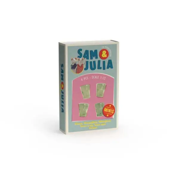 Splendida miniatura di bicchieri in simil-vetro per la mini cucina di Mouse Mansion: 4 bicchieri trasparenti, confezionati dentro una piccola scatola di fiammiferi dal gusto retrò. Consigliato dai 6 anni