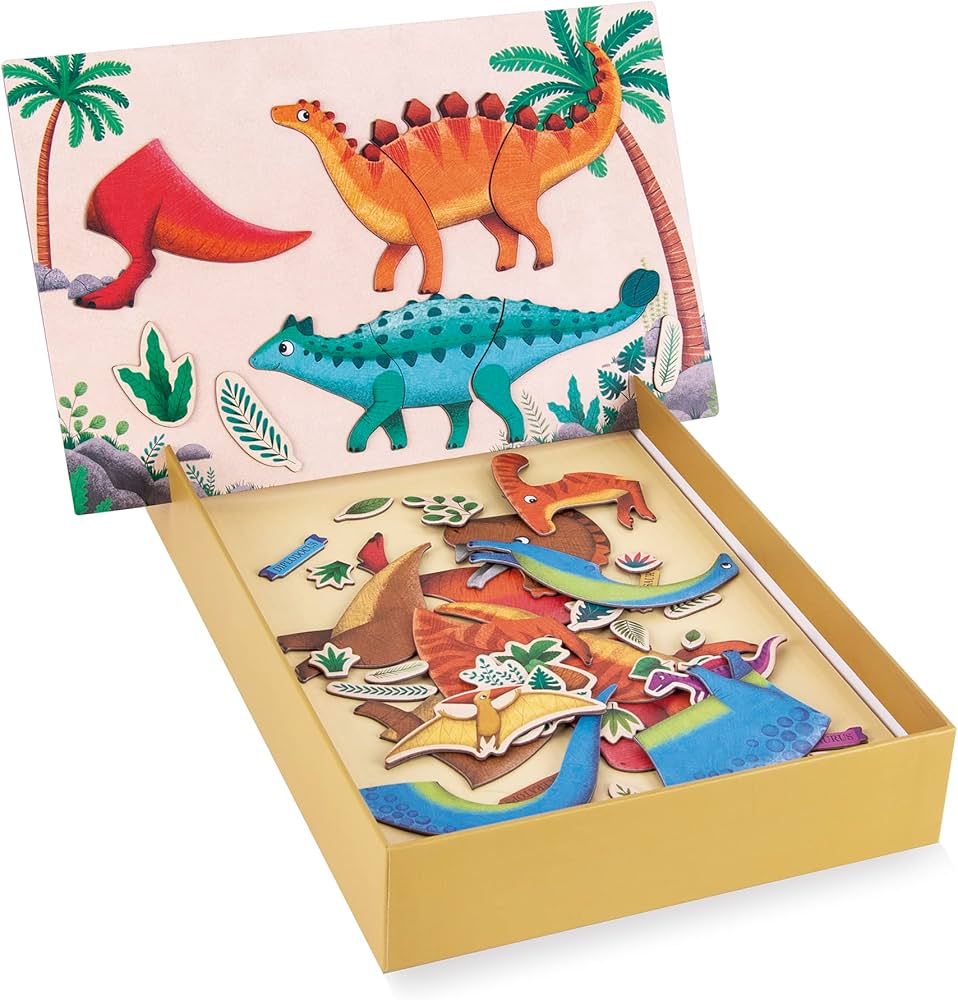 52 magneti con diverse parti del corpo dei dinosauri per poterli ricomporre e andare alla scoperta del loro fantastico mondo.Tutto in cartone molto spesso, comodamente giocabile nella sua scatola riponibile in poco spazio. Consigliato dai 4 anni