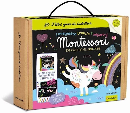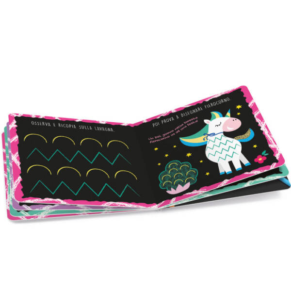Della serie Traccio e Imparo, seguendo il metodo Montessori, queste lavagnette e il libretto permettono di seguire i contorni degli unicorni rappresentati, come le punte della criniera dei cavalli o i triangoli sulla pancia. Un percorso creato per i più piccoli per divertirsi sperimentando il segno grafico, propedeutico alla scrittura. In robusto cartone con gessetti colorati compresi, consigliato dai 3 anni