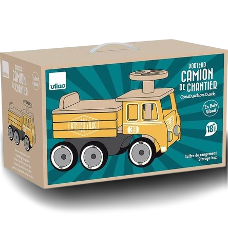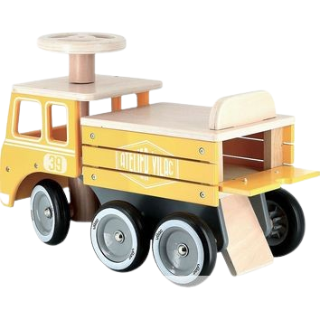 Colorato camion giallo, pieno di dettagli e con un cassone cha fa da seduta ma ha anche lo spazio per caricare. In robusto legno, comodo e spazioso, può portare fino a 30Kg. Montato ha le misure di 50x26x35 cm. Realizzato in legno garantito di produzione francese e colori smaltati, è consigliato dai 18 mesi